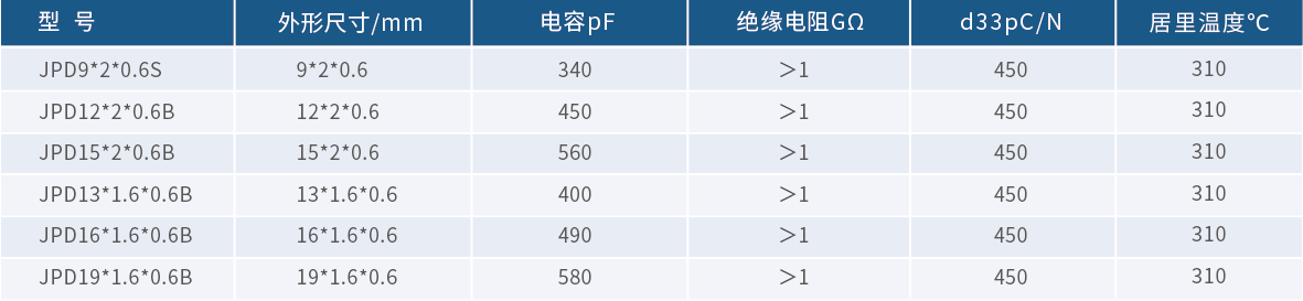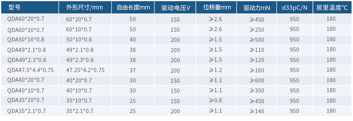 压电双晶片(驱动型) 利用压电陶瓷的逆压电效应,在电场的驱动下产生横向位移的弯曲元件。结构上采用两片压电陶瓷及高韧性弹性芯紧密粘接而成,在交变电源的驱动下产生相应的振动幅度,应用于微位移驱动装置。